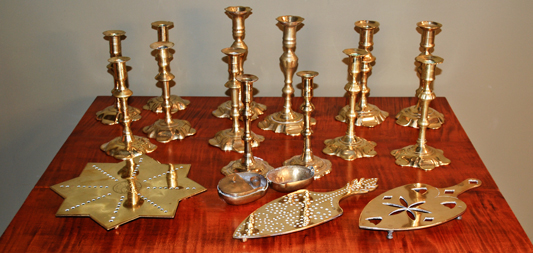 Always a Selection of Early Brass, including Queen Anne Candlesticks, Andirons, Fireplace Tools, Fenders and Jamb Hooks