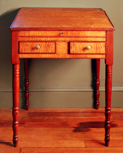 Sheraton Birdseye and Tiger Maple Schoolmaster Desk with Great Cracked Surface, New England,